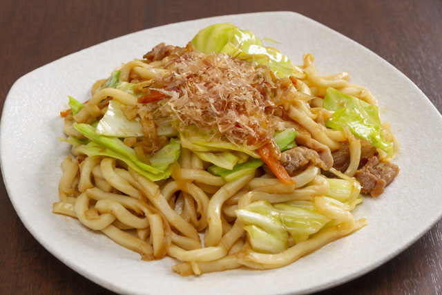 - ⑤うどんを入れて炒め、粉末パスタソース<ペペロンチーノ>入れて手早く炒め合わせたら器に盛りつける