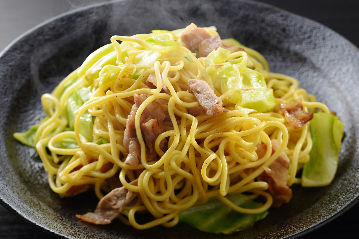- ④焼きそば麺と水を加え、麺をほぐしながら炒める