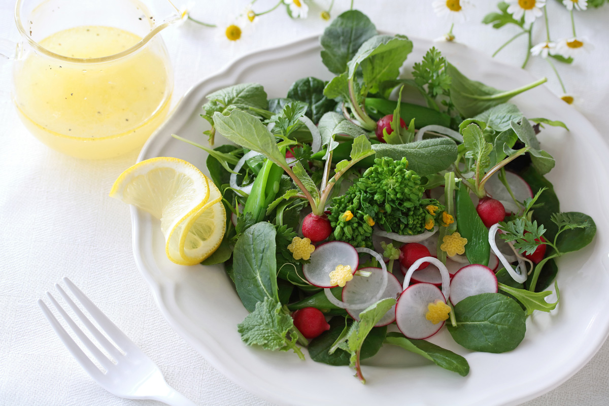 - ②ボウルにオリーブ油、酢、粉末パスタソース<レモンペッパー風味>を入れ、よく混ぜる